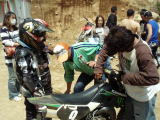 しばらく姫様の姿が見えなくなったんで、こりゃ裏の方でコケテルぞ! 2周位してからやっとこさコースに復帰してきた姫様、 プッツンしたのでしょうか? 怒涛の追い上げで、すばらしい走りになりました。 スゲー!と感心したところ・・・・・・・・。 ←休憩です。 あのぉ・・・30分位休憩無しで走れませんか? 問題外ですねぇ モトクロスより先に体力作りが必要みたいです。 はぁ!(ため息) |